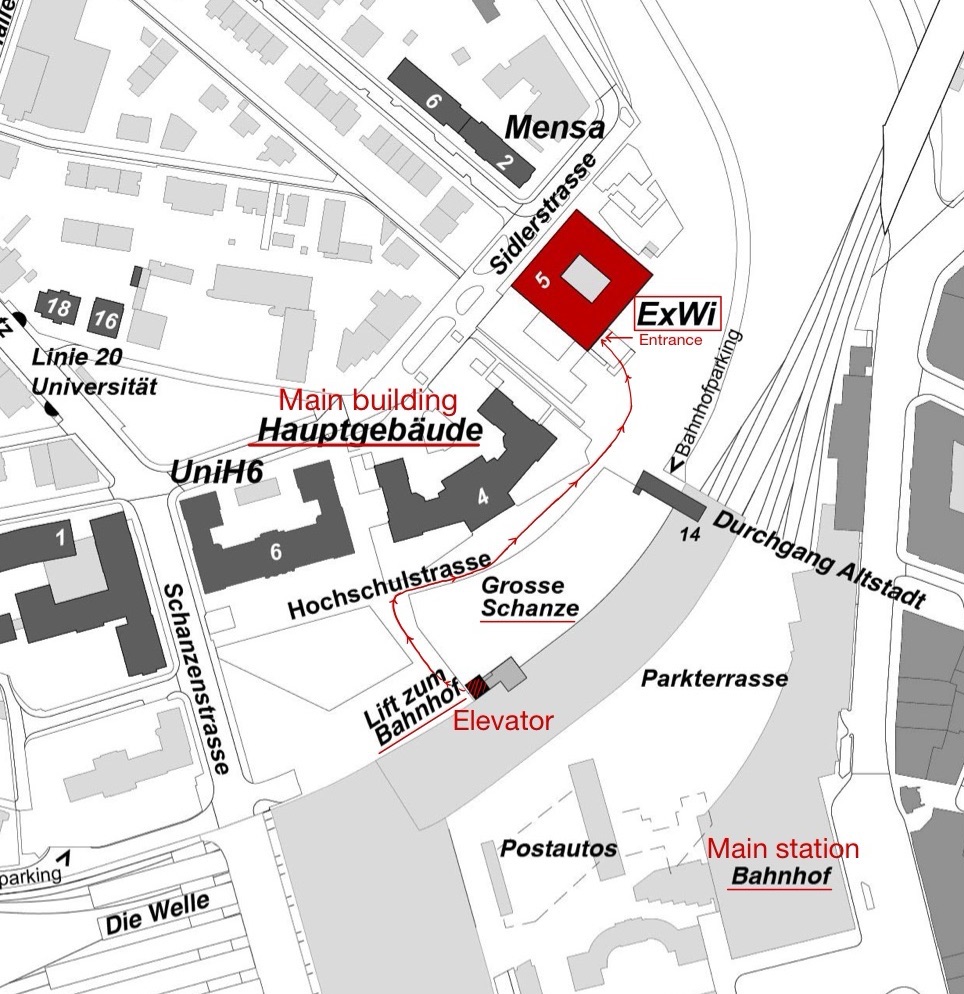 The conference will be held at the University of Bern, in the ExWi building. The address is Sidlerstrasse 5, 3012 Bern. Since most of you will arrive by public transport at the main station, we will describe the way from the main station to the conference venue.